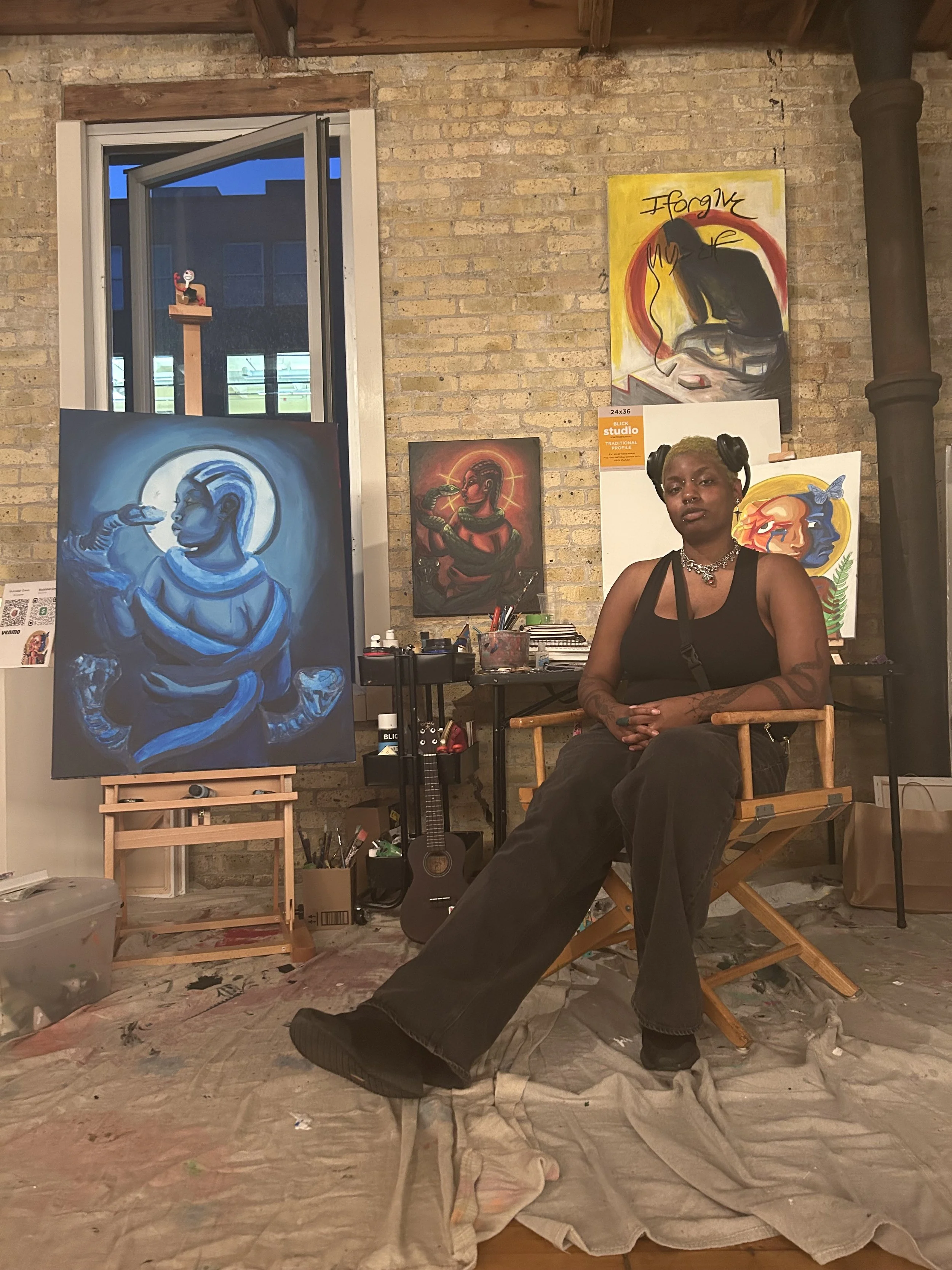 Muta’aliah has been one of Milwaukee’s most engaging and eye-catching visual artists since 2021. You may recognize the name from being in creative art shows such as Some Fools, Bronzeville Artwalk, Mitchell Street Arts, and La Gente Art Gallery. Their journey has been far from traditional; after dropping out of UW-Milwaukee in 2020, while the pandemic had us all on lockdown, Muta’s passion for art did not die; rather, it intensified. From beginning, a self-taught journey of tracing, they quickly realized the help of other talented individuals would be one of the secret sauces to becoming successful and educated. Collaborating, studying, and watching muralists, painters, and several other types of artists from Milwaukee Institute of Art & Design (MIAD) became their everyday routine and instilled more hunger inside Muta’aliah to hone in on their craft as well as apply their own flavor and personality to it. As we sat down, Muta expressed to me that their creative process is to always look at what is transpiring in their own life; from adversaries, accomplishments, and lessons, pull the current emotions out of it and formulate pieces that will display the feeling of what Muta is or has gone through over their lifetime.