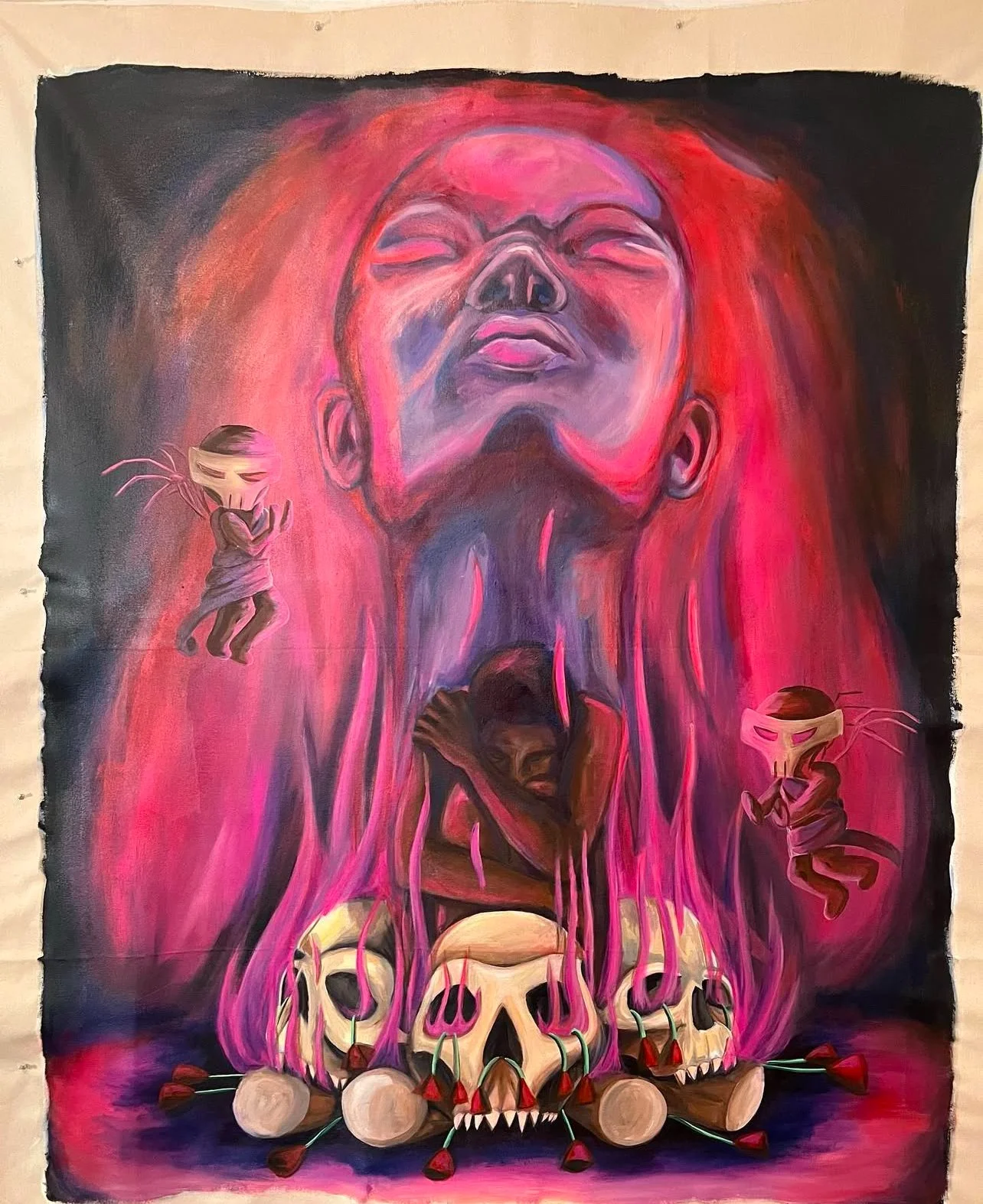 I was gifted with the presence of Muta’s vulnerable side from the very beginning of the interview. Harsh topics such as psychosis, family trauma, and depression were uncovered and discussed layer by layer. It’s often assumed that visual artists only display positive depictions of life and emotions onto their canvases, buildings and streets; but Muta’aliah gave me a few pages out of their book that was quite the opposite. For Muta, murals and paintings created by them is a coping mechanism and healing process for their own pathway of life. Healing is not linear, predictable, or set on a specific deadline that means your life will go back to being normal or at its most happiest for the rest of your life. Through creating and sharing a message not often discussed, Muta’aliah’s art is more than eccentric and vibrant. In 2023, the artist went through psychosis where they were constantly on edge and had auditory as well as visual hallucinations due to a traumatic event that occurred. Their art piece entitled, “I Kill Vampires” was the therapeutic representation of Muta overcoming psychosis and claiming power of one’s own life back.