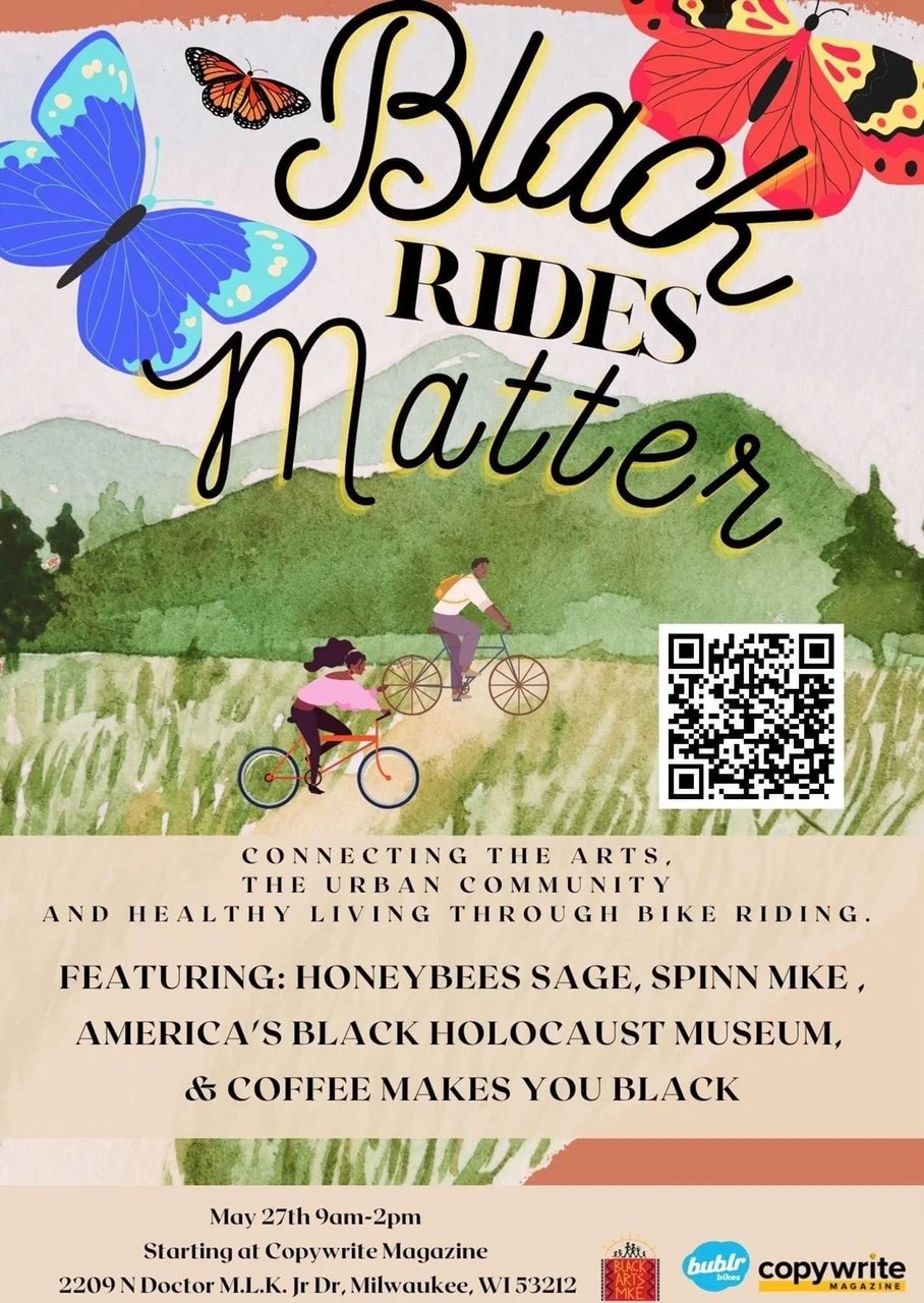 Please join Black Arts MKE for their first ever Black Rides Matter bike ride. We will meet up at CopyWrite Magazine at 9am and during the ride we will visit four black owned businesses, Honeybee Sage, Spinn MKE, America's Black Holocaust Museum and Coffee Makes You Black. The bike ride will conclude at Coffee with riders having the opportunity to buy food and enjoy a DJ.